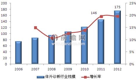 前瞻產(chǎn)業(yè)院《2013-2017年中國(guó)體外診斷行業(yè)市場(chǎng)需求預(yù)測(cè)與投資戰(zhàn)略規(guī)劃分析報(bào)告》數(shù)據(jù)顯示,2006年以來,國(guó)內(nèi)體外診斷產(chǎn)業(yè)以15%左右的年增長(zhǎng)率呈現(xiàn)高速增長(zhǎng)態(tài)勢(shì)。據(jù)統(tǒng)計(jì),2008年我國(guó)體外診斷市場(chǎng)規(guī)模已達(dá)95億元,2010年增長(zhǎng)至122億元,2011年突破140億元,到2012年,我國(guó)體外診斷市場(chǎng)規(guī)模約為175億元。