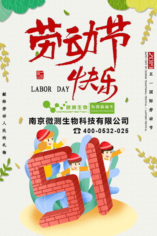南京微測生物科技有限公司祝新老客戶朋友五一勞動節(jié)快樂!友情提示:2019年5月1日起至2019年5月4日放假,共計4天,放假期間不發(fā)貨,5月5日上班恢復(fù)正常發(fā)貨。