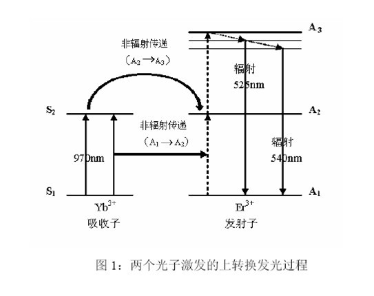 自然界中存在很多有機(jī)或無(wú)機(jī)物質(zhì),它們可以在電磁輻射激發(fā)下發(fā)射熒光或磷光,且在發(fā)光過(guò)程中遵守Stokes 規(guī)則,即發(fā)射光的波長(zhǎng)長(zhǎng)于激發(fā)光的波長(zhǎng)。而在20 世紀(jì)70 年代,科學(xué)家們卻合成了一類可以反Stokes 規(guī)則產(chǎn)生磷光的特殊材料,即UCP。UCP 在紅外光區(qū)(波長(zhǎng)>780nm)被激發(fā),卻可以發(fā)射波長(zhǎng)遠(yuǎn)短于激發(fā)光的可見(jiàn)光(波長(zhǎng)475nm-670nm),即能量上轉(zhuǎn)換。物質(zhì)構(gòu)成決定性質(zhì)特點(diǎn)。UCP 是由稀土金屬元素?fù)诫s于晶體的晶格中構(gòu)成的。在這種材料中有三種主要的成分:主基質(zhì)(Host Matrix)、吸收子(Absorber)和發(fā)射子(Emitter)。作為主基質(zhì)的晶體材料有:氧硫化物(如Y2O2S、GdO2S、La2O2S 等)、氟化物(如YF3、GdF3、LaF3 等)、鎵酸鹽(如YGaO3、Y3Ga5O12 等)以及硅酸鹽(如YSi2O5、YSi3O7 等)等;常用作吸收子的稀土金屬離子有:鐿離子(Yb3+)、鉺離子(Er3+)、釤離子(Sm3+)等;常用作發(fā)射子的稀土金屬離子有:鉺離子(Er3+)、鈥離子(Ho3+)、銩離子(Tm3+)、鋱離子(Tb3+)等。吸收子和發(fā)射子這一離子對(duì)在主基質(zhì)晶格內(nèi)適宜的空間取向和距離,是產(chǎn)生上轉(zhuǎn)換發(fā)光的基礎(chǔ)。上轉(zhuǎn)換發(fā)光的產(chǎn)生是一個(gè)涉及多個(gè)(至少兩個(gè))光子的光學(xué)過(guò)程。在這個(gè)過(guò)程中(如圖1),UCP 內(nèi)的吸收子(如Yb3+)至少要吸收兩個(gè)低能量光子(紅外光區(qū),如970nm),而后經(jīng)過(guò)一系列內(nèi)部能量轉(zhuǎn)換,以非輻射的形式(A1→A2,A2→A3)將這兩個(gè)光子的能量連續(xù)傳遞給發(fā)射子(如Er3+),以使其處于激發(fā)態(tài)(A3)。后者接著發(fā)生一個(gè)返回基態(tài)能級(jí)的躍遷,釋放一個(gè)高能光子(可見(jiàn)光區(qū),如525nm 或540nm),完成能量上轉(zhuǎn)換。